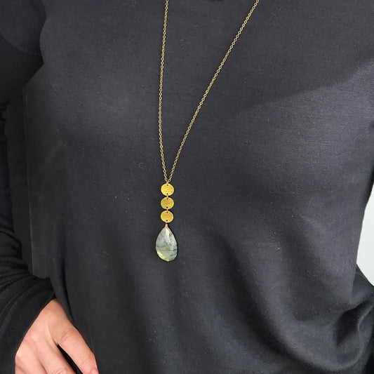 Edgy Petal Labradorite Hammered Triple Disk Long Chain Necklace
