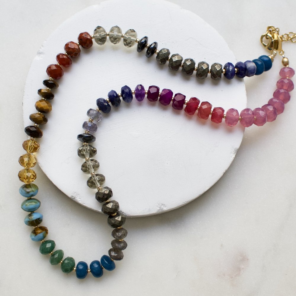 Dark Multi Necklace is made of; Teal/Green/Purple Berry/ Red Jade, Sodalite, Lapis, Montana Blue, Smokey Topaz, Fire Polished Citrine, FP Champagne Citrine, Purple FP Crystal, Carnelian, Tiger's Eye, Green Turquoise, Labradorite, Iolite, Amethyst and Rhodocrosite
