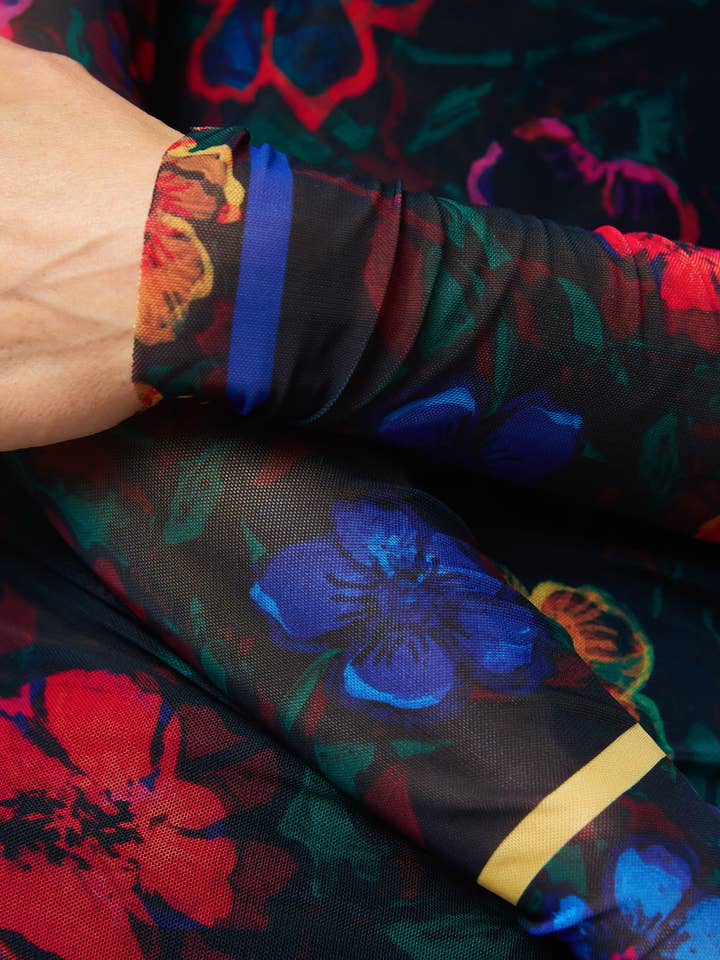 Fitted semi sheer top with a high crew neck and fitted long sleeves