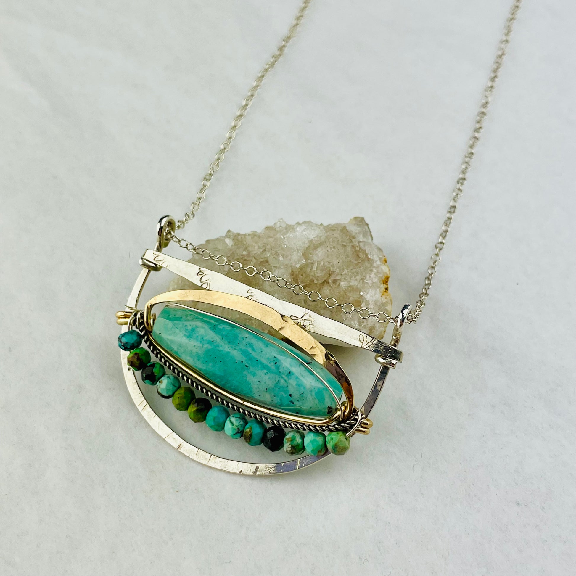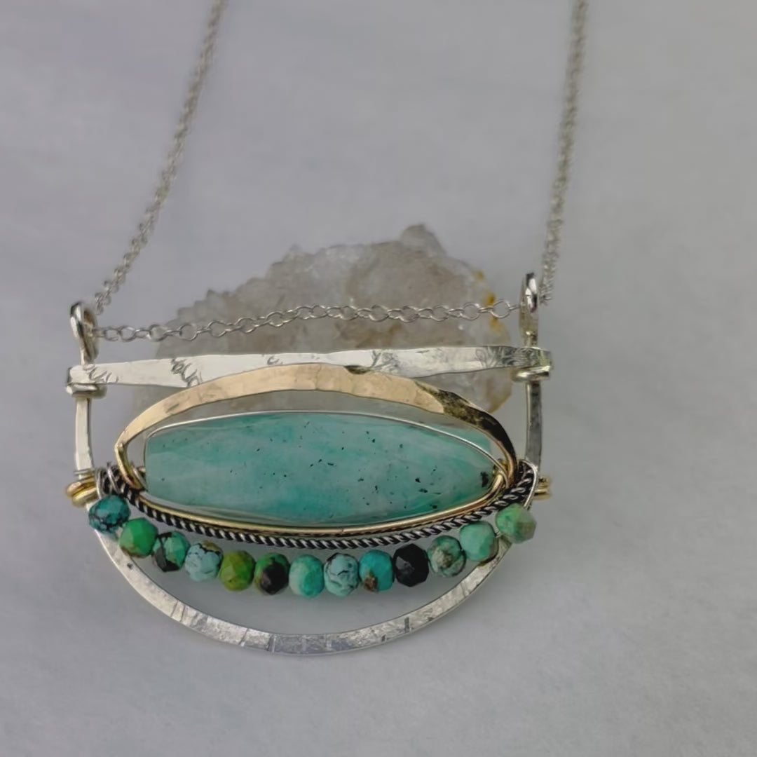 Amazonite demential faceted gemstone is set in hammered brass and outlined with faceted chrysocolla gemstones. Sterling silver hand made pendant is designed to easily slide along the chain