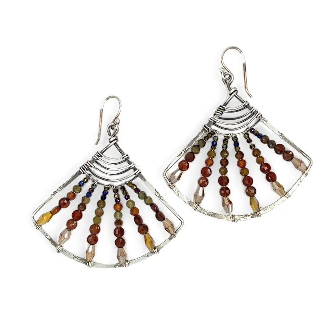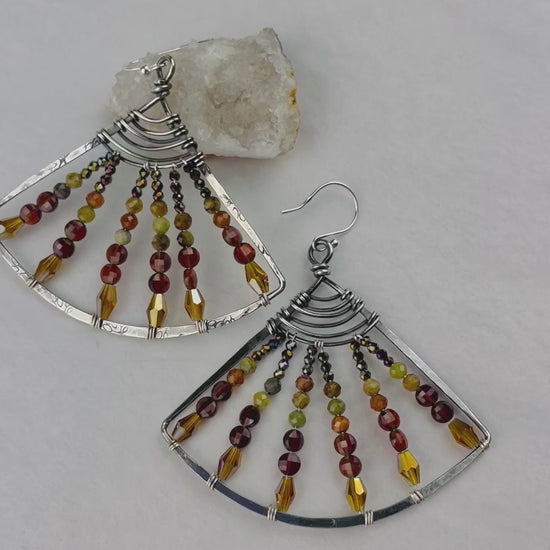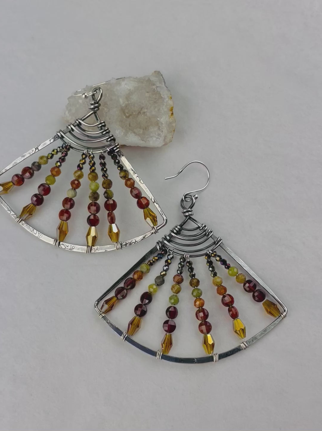 Grossular and hessonite garnet micro faceted gemstones with bicone crystal lines our handmade sterling silver fan earrings