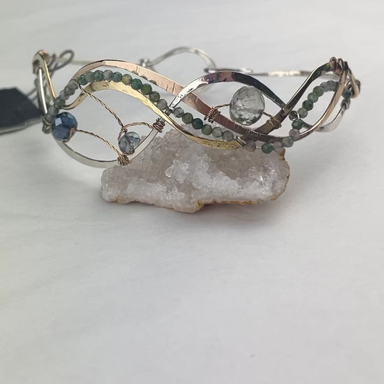 Moss agate and green amethyst micro faceted gemstones entwine with layers of hand formed hammered brass and sterling silver to grow like ivy into a cuff bracelet