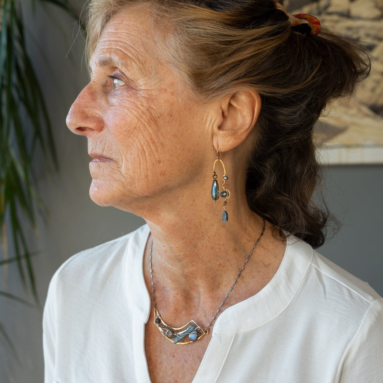 Raw kyanite, fresh water pearl and crystal earrings on handmade hammered brass sculptures and gold-filled and twist brass wires