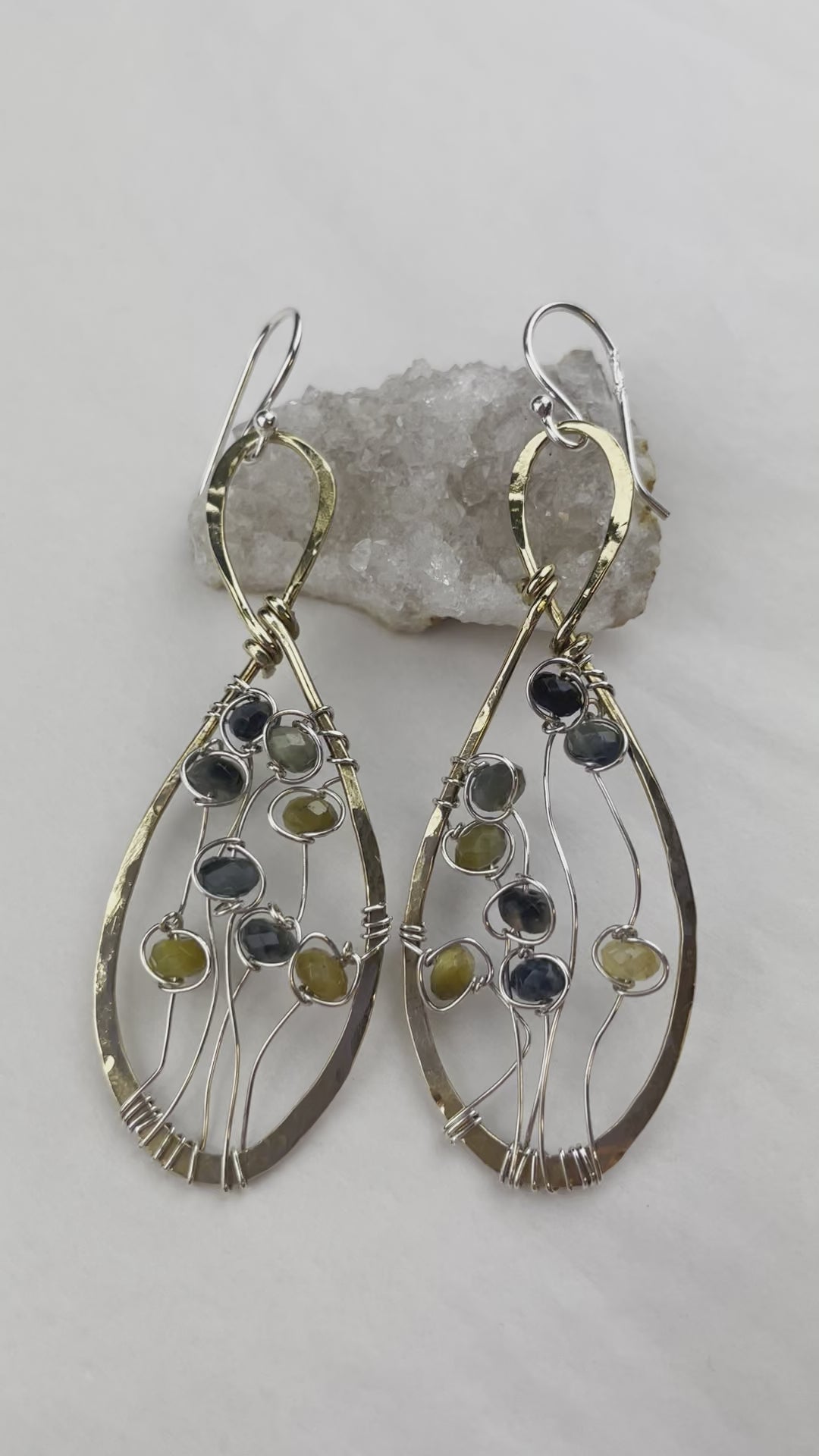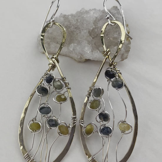 Tiger eye ombre faceted gemstones individually wrapped in fine sterling silver grow up in a hand made brass drop earring like a little field of wild grasses.