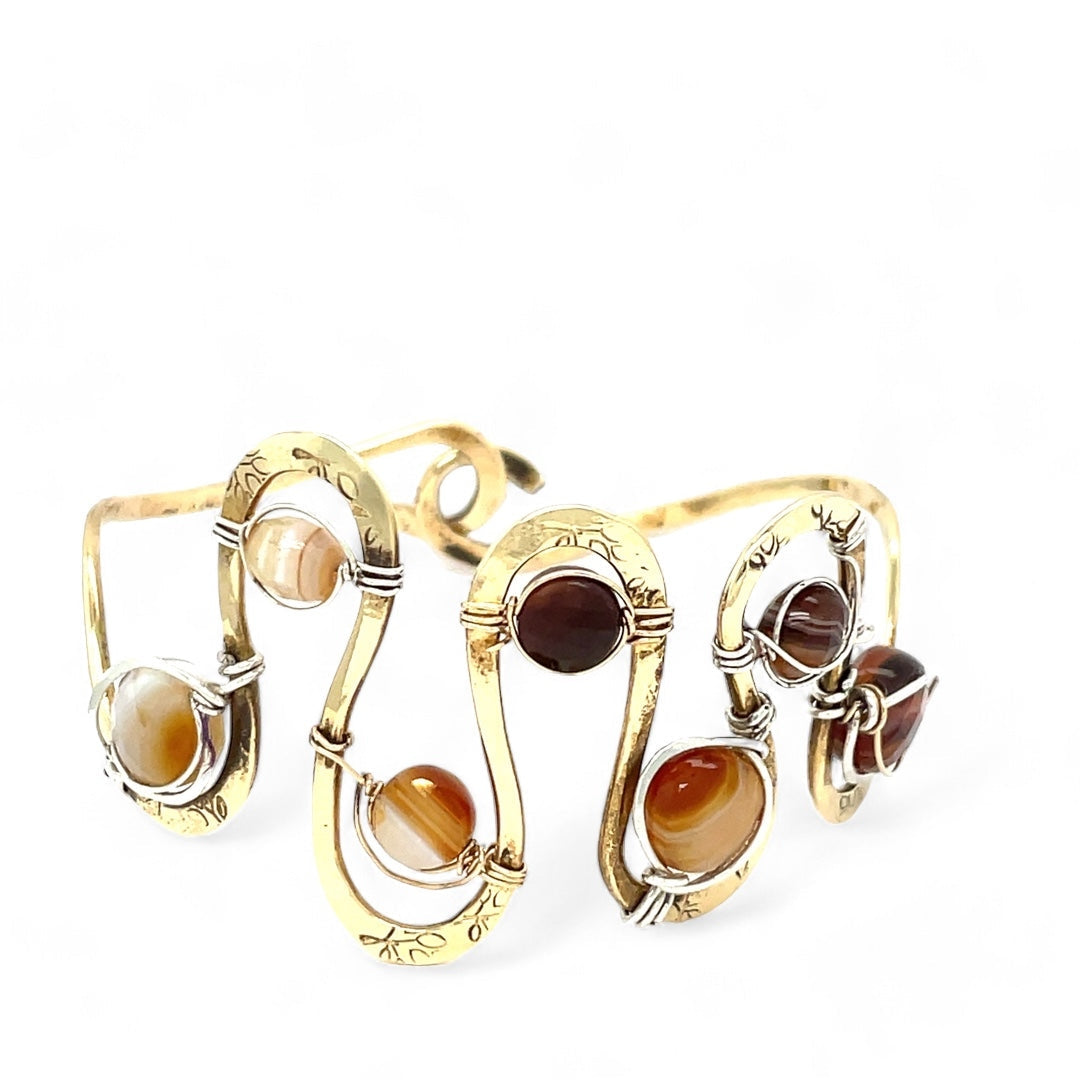 Banded brown faceted agate coins carefully chosen and set in sterling silver to hammered hand formed stamped brass winding cuff bracelet