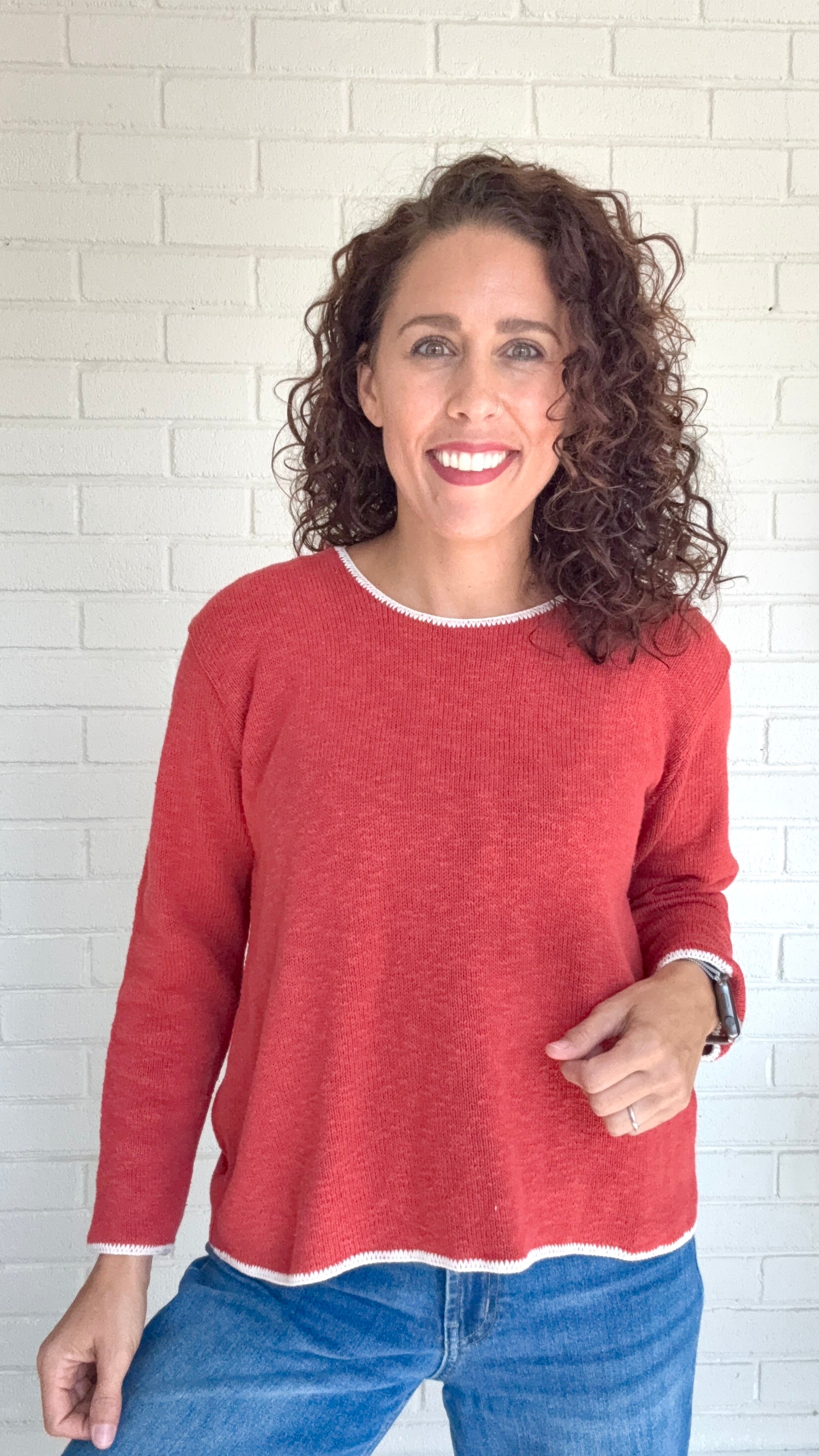 Relaxed, boxy style sweater with crew neck with contract stitching detail on neck cuffs and ham, drop shoulder seams and semi-relaxed long sleeves