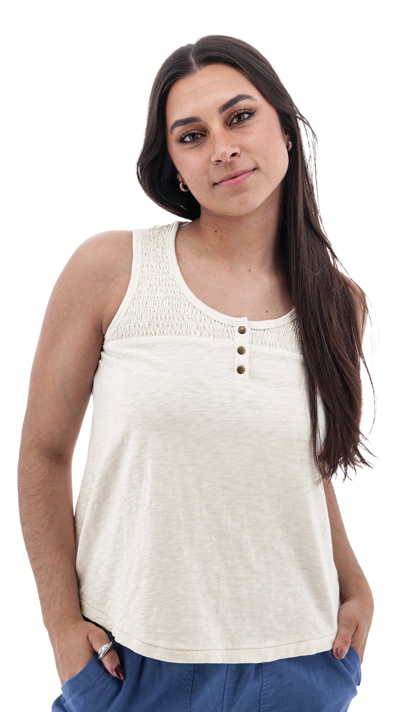 Relaxed fit tank with smoked detail on the front and back (for added shape through the shoulder and bust) and snap closure at front placket for style