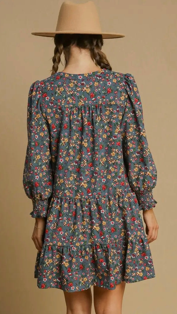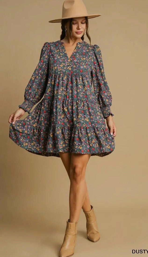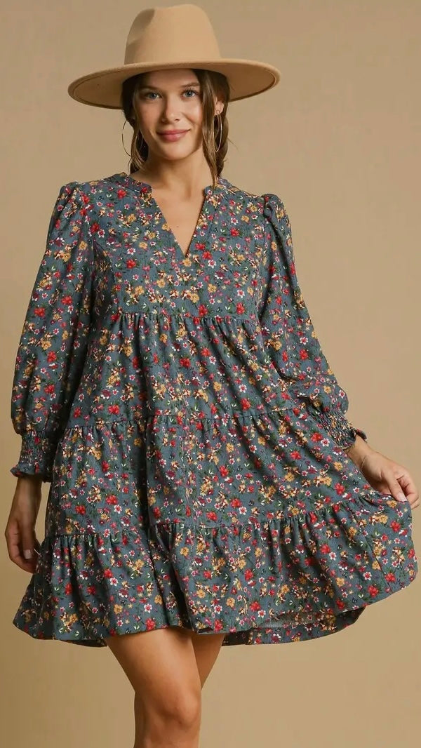 Relaxed, a-line style tiered dress with relaxed smocked long sleeves, v-neck and 2 side pockets