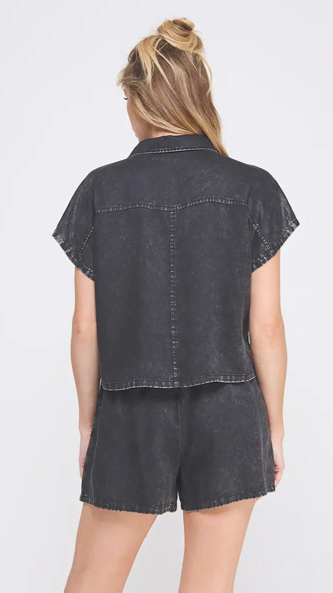 Boxy, cropped style button down shirt with relaxed dolman cap sleeves and back seaming details