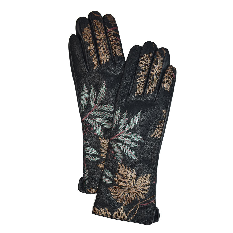 Leaf print on genuine soft sheepskin leather and a velvet liner