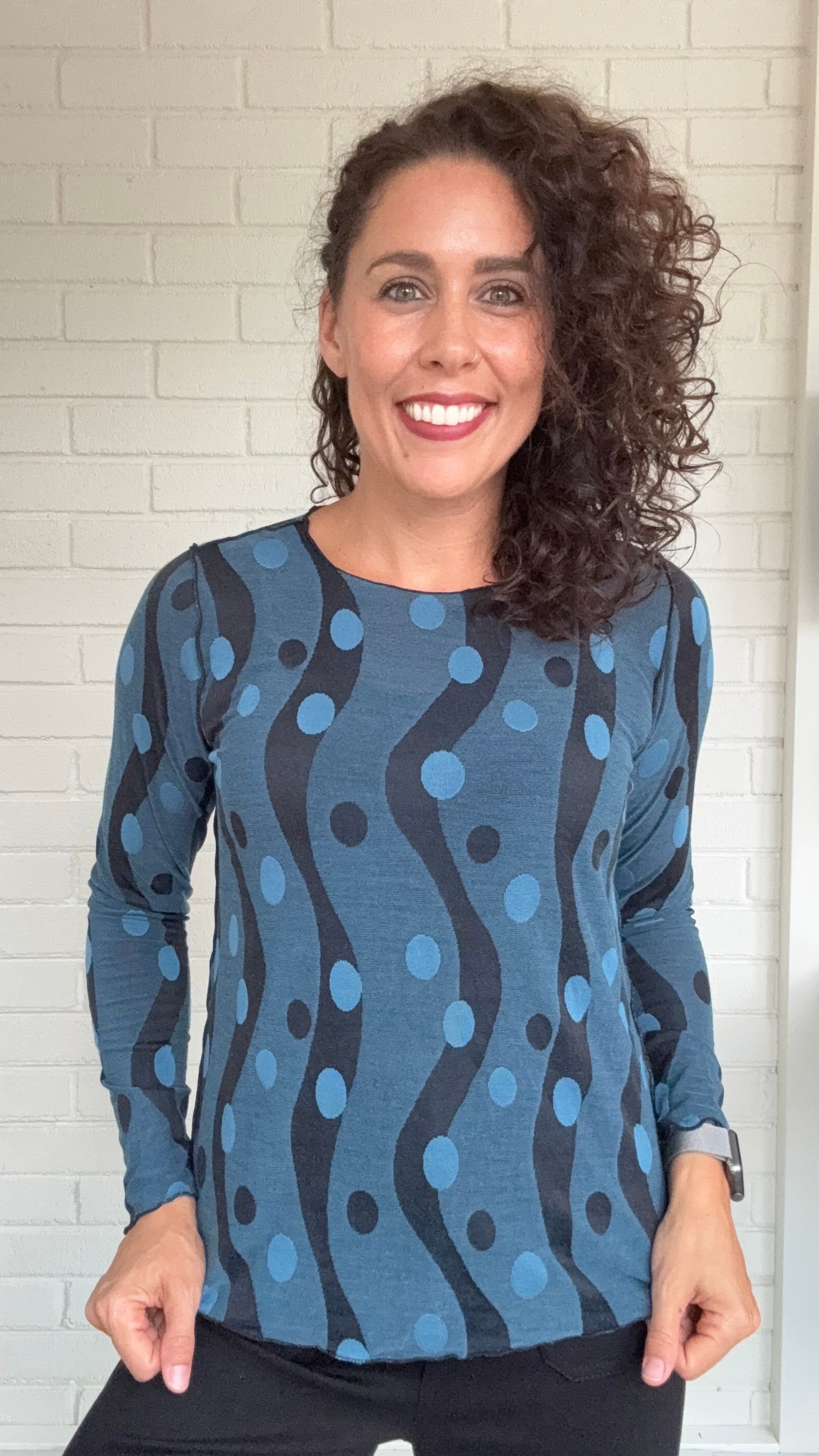 Slightly fitted tee with slight boatneck, fitted long sleeves and pearl edging. Looks great tucked in with wide pants for added shape (see photo)