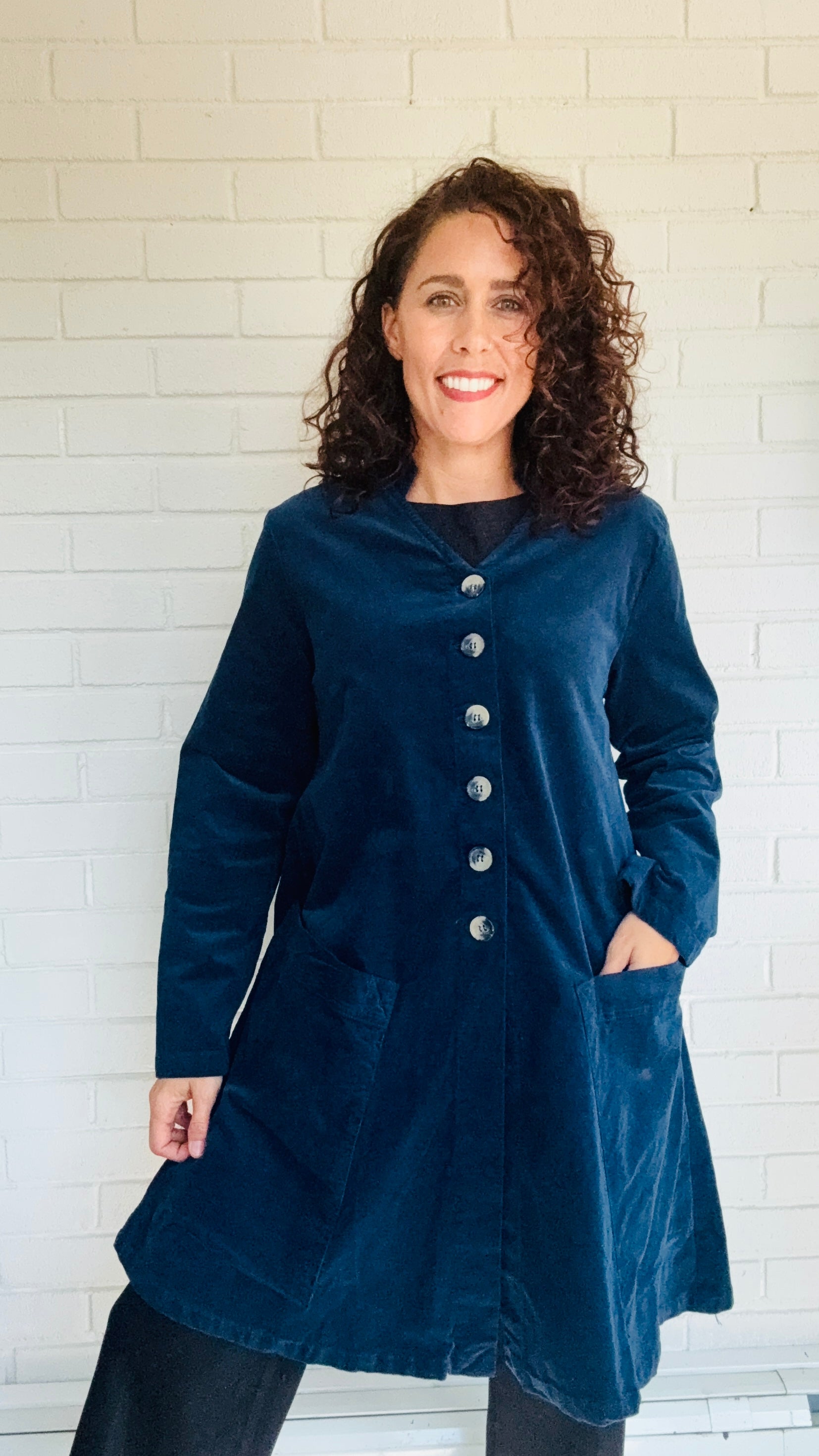 Relaxed, a-line style jacket with notch collar, relaxed long sleeves, 2 front patch pockets and front button half closure