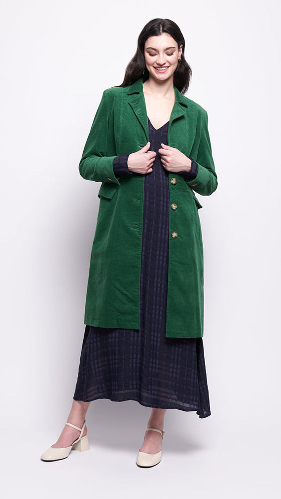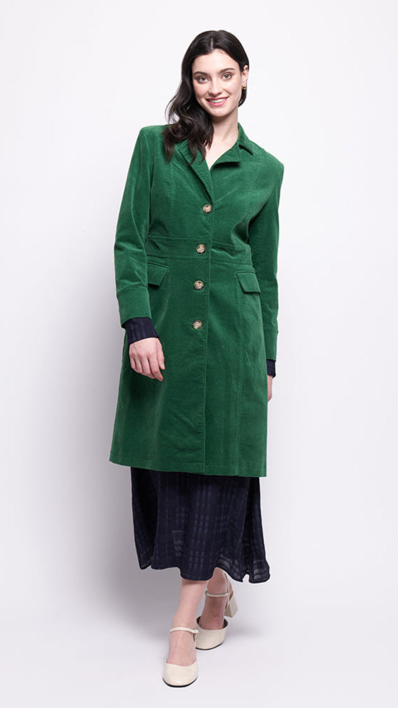 Tailored stye long velvet coat with front 4-button closure, semi-fitted long sleeves and 1 button closure detail, 2 flap pockets, princess seaming through for great shape and button flaps along waist in the back for waist definition (see photo)
