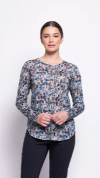 Relaxed, straight style tee with round neck, semi-fitted long sleeves and rounded hem. Looks great tucked in with wide pants or worn out with narrow pants or jeans