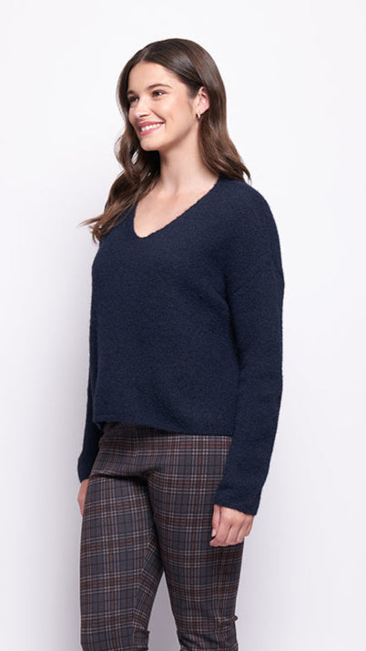 Relaxed, boxy style sweater with v-neck, drop shoulder seams, semi-fitted long sleeves and a very slight hi-low hem