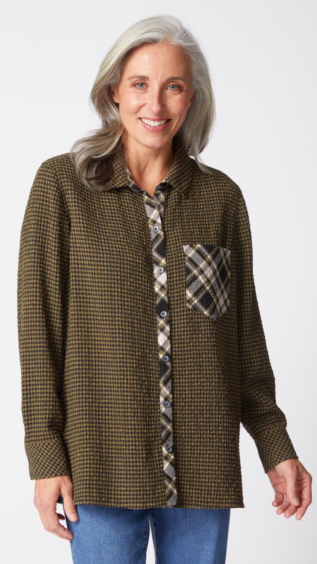 Relaxed, straight style button up shirt with semi-relaxed long sleeves with button detail, 1 front patch pocket, rounded hem and an interesting mix of fabric