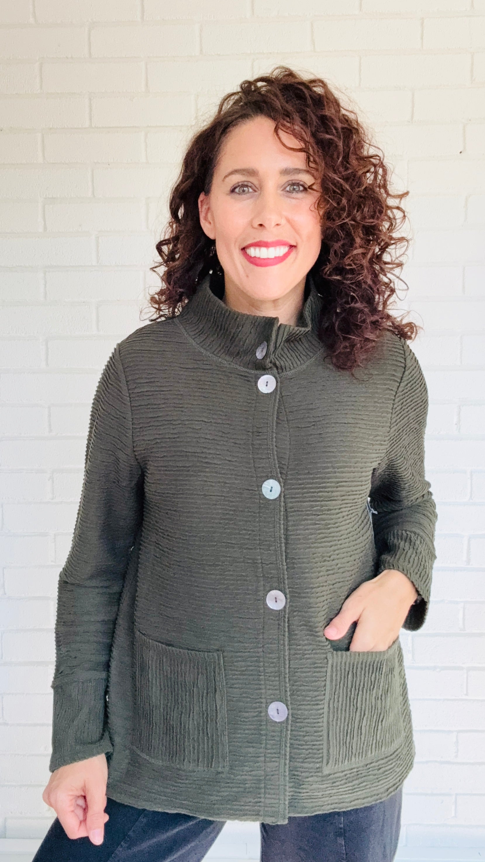 Slightly relaxed, straight style cardigan with semi-fitted long sleeves, front button closure, mock neck and 2 front patch pockets