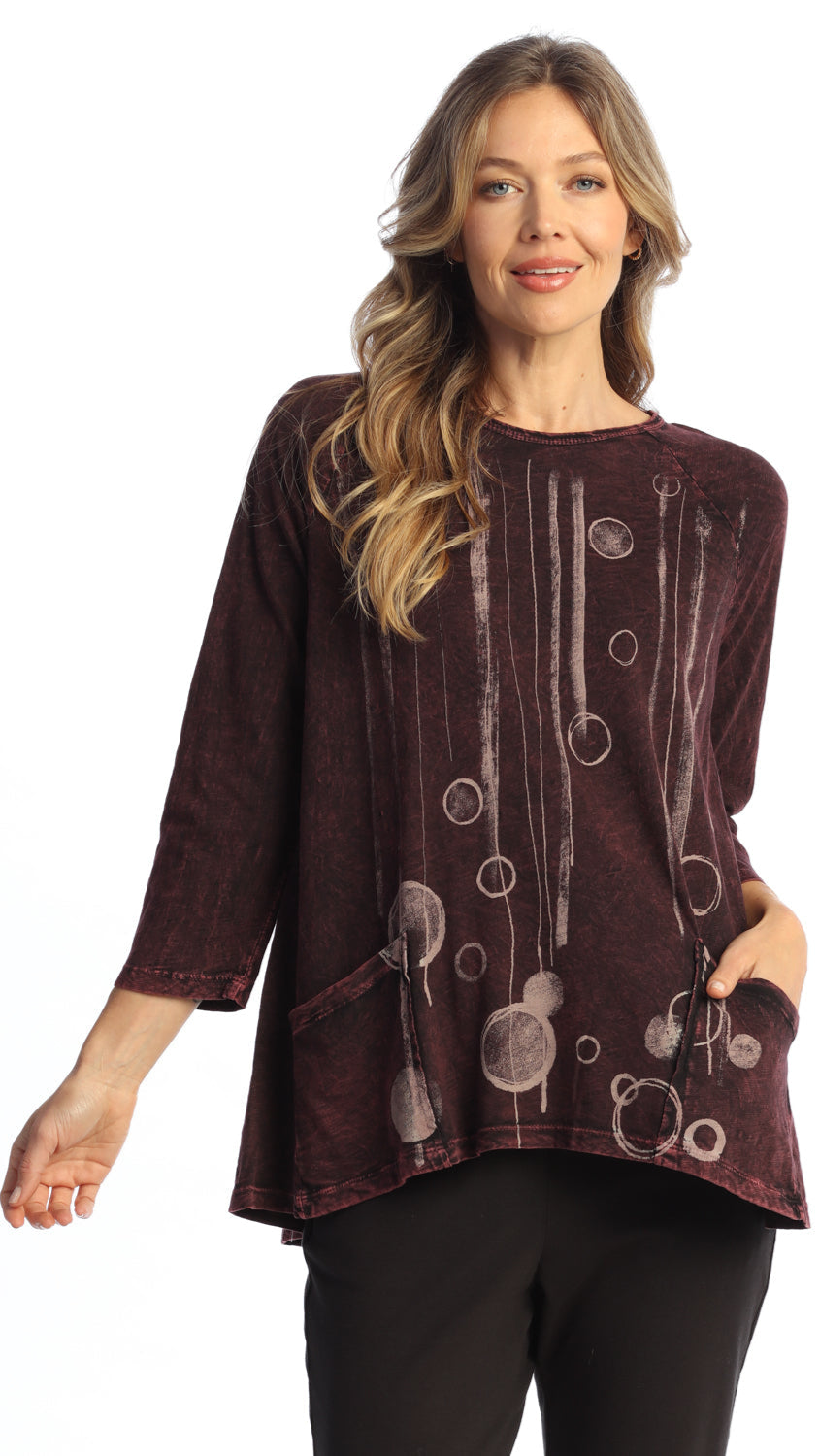 Swing, relaxed style tunic with a round neck, raglan shoulder seams, semi-relaxed 3/4 sleeves and 2 front patch pockets with a slight hi-low hem