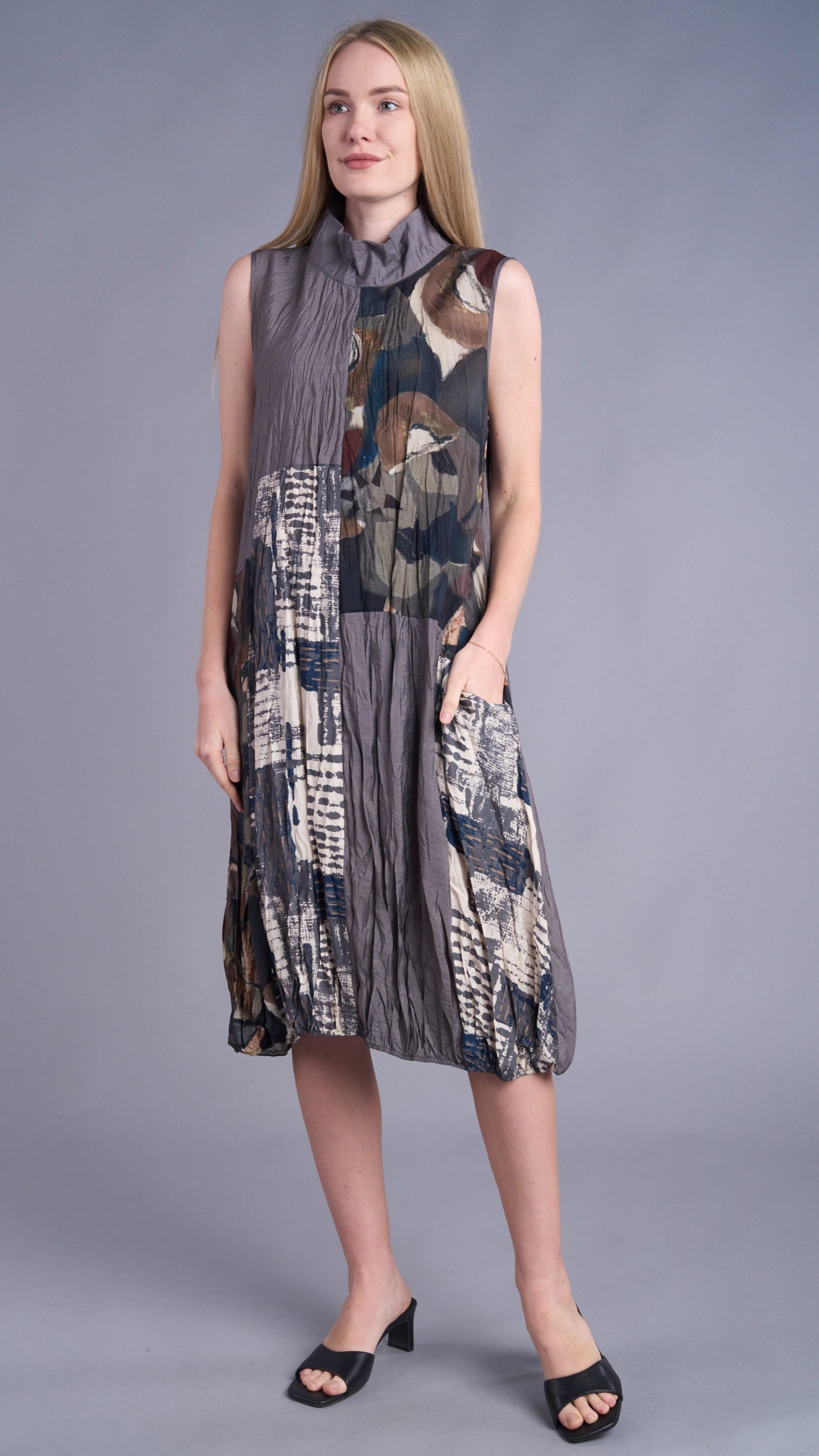 Shift style tank dress with a stand-up collar, 1 front patch pocket, elastic bottom hem and interesting seaming details