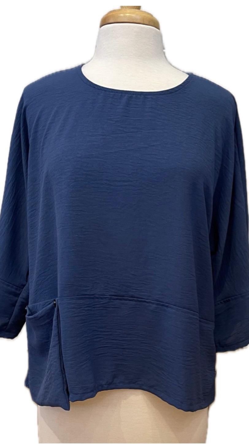Relaxed, boxy style top raglan relaxed 3/4 sleeves, slight hi-low hem and one front pocket