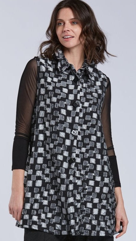 Straight style vest with wire collar, front button closure and 2 rounded side pockets