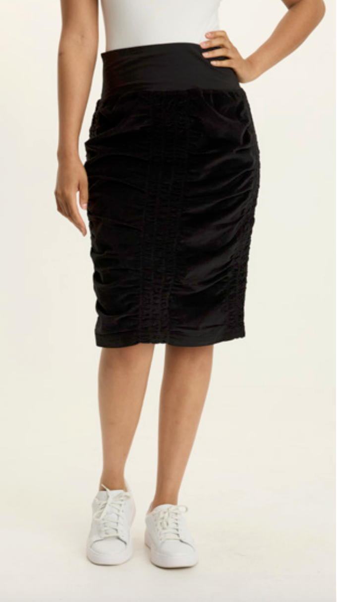 Fitted pencil style skirt with ruching detail and a soft stretchy waistband that folds over so you can adjust the length of the skirt