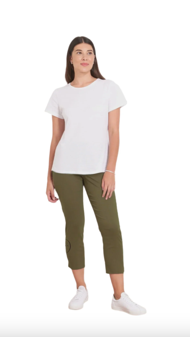 Narrow style pull on capri pant with elastic waist, 2 side pockets and 1.5" side slits at the bottom hem