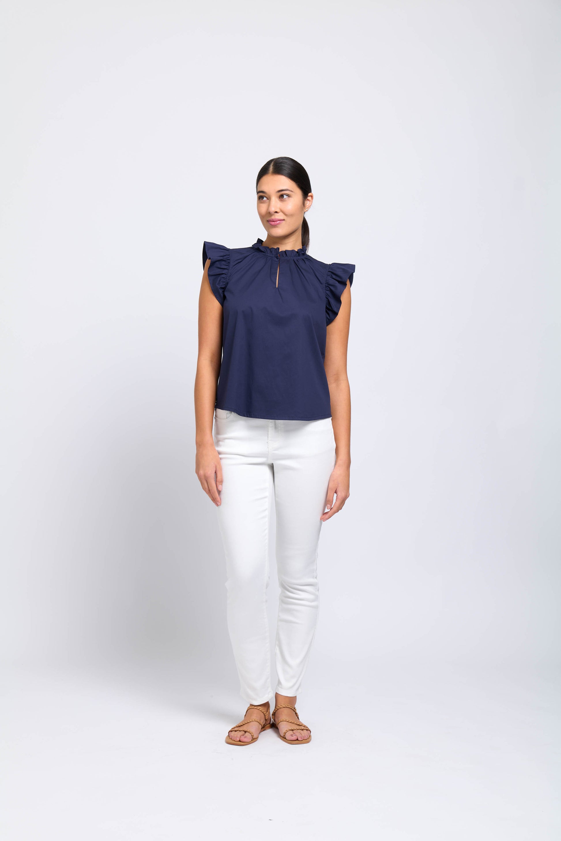Slight boxy style top with a high neckline with notch in the center that either closes or opens to a v-neck, stand up collar, ruffle cap sleeves and rounded hem in back