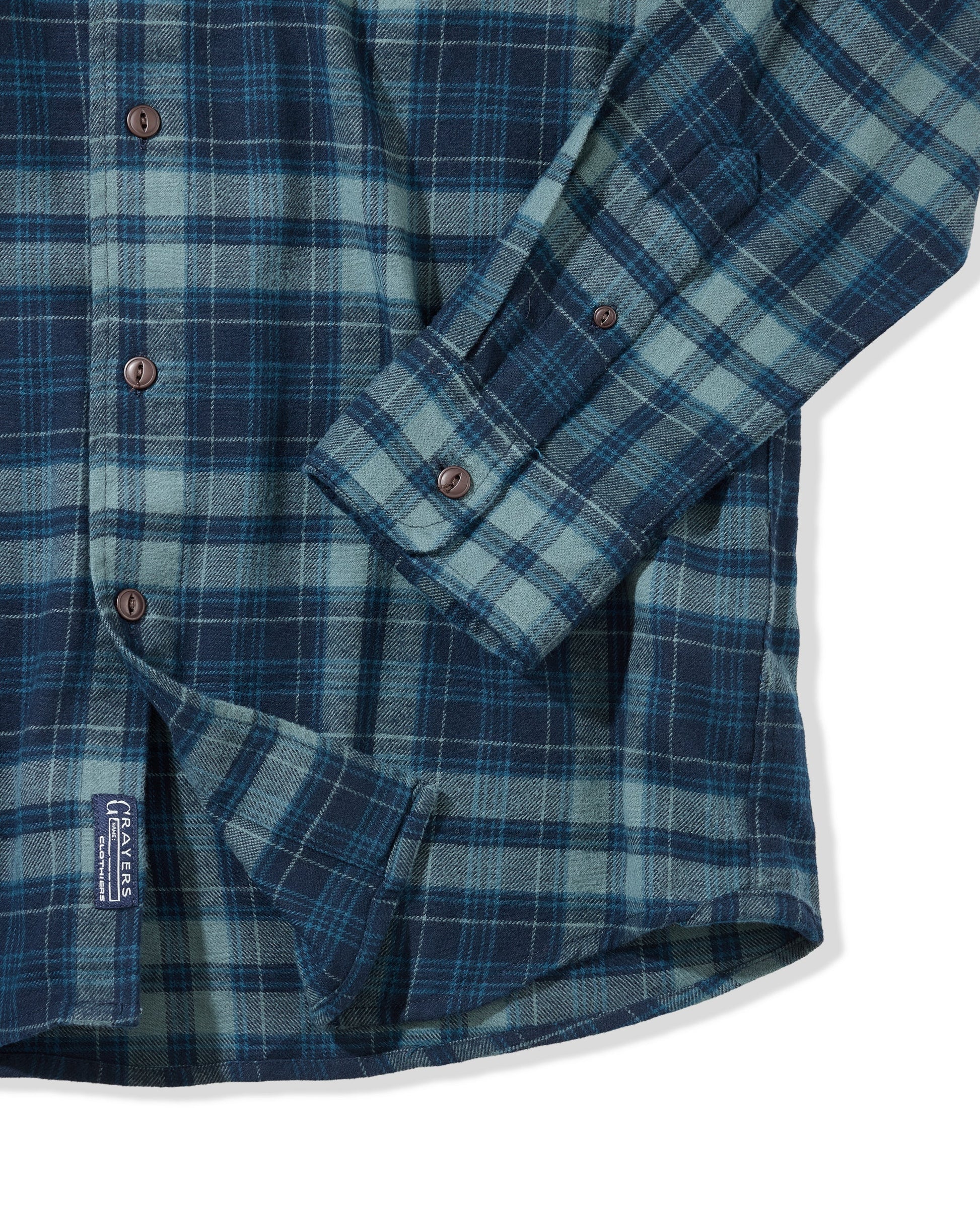 Relaxed fit button up flannel with button closure, 1 chest pocket, relaxed long sleeves with button cuffs and rounded hem