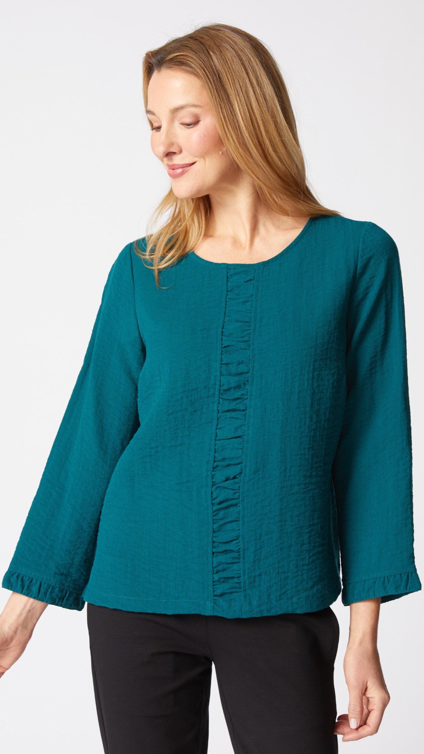 Boxy, gentle a-line style ruched front top with semi-relaxed 3/4 sleeves with ruched band detail, 2" bottom side slits and breast darts for added shape