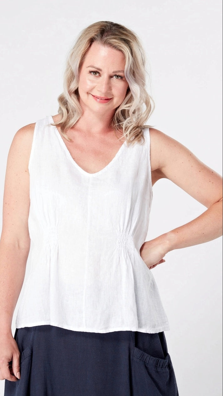 Relaxed, fit and flare style tank with a v-neck and two ruching details in the front and one in the back for added shape