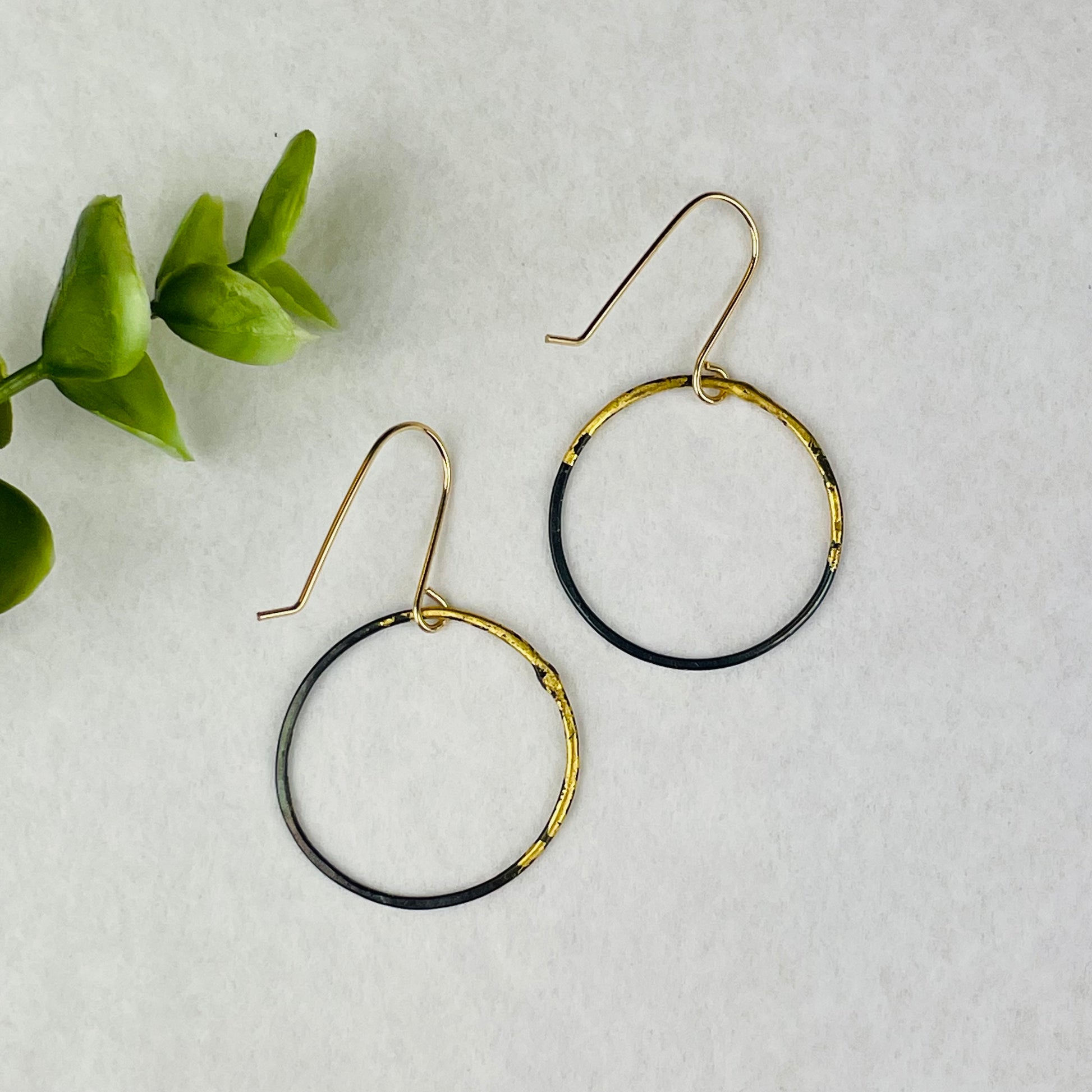 Industrial hoops with a touch of sparkle! Thin forged hoops of blackened steel with a 23k gold leaf accent