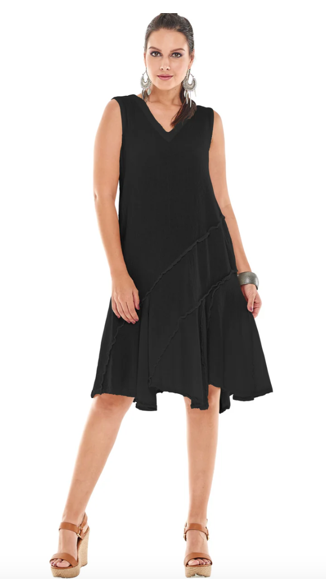 Fit and flare style dress with seaming details, slight uneven hem and a v-neck that is very bra friendly