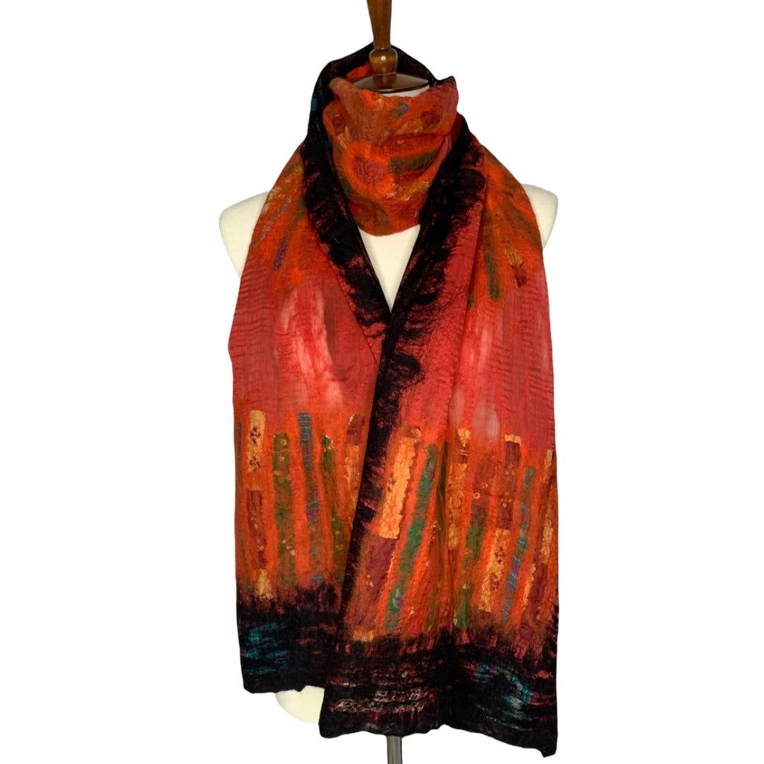 A warm and cool sun rays design made with strips of recycled sari shining through rich colored merino wool