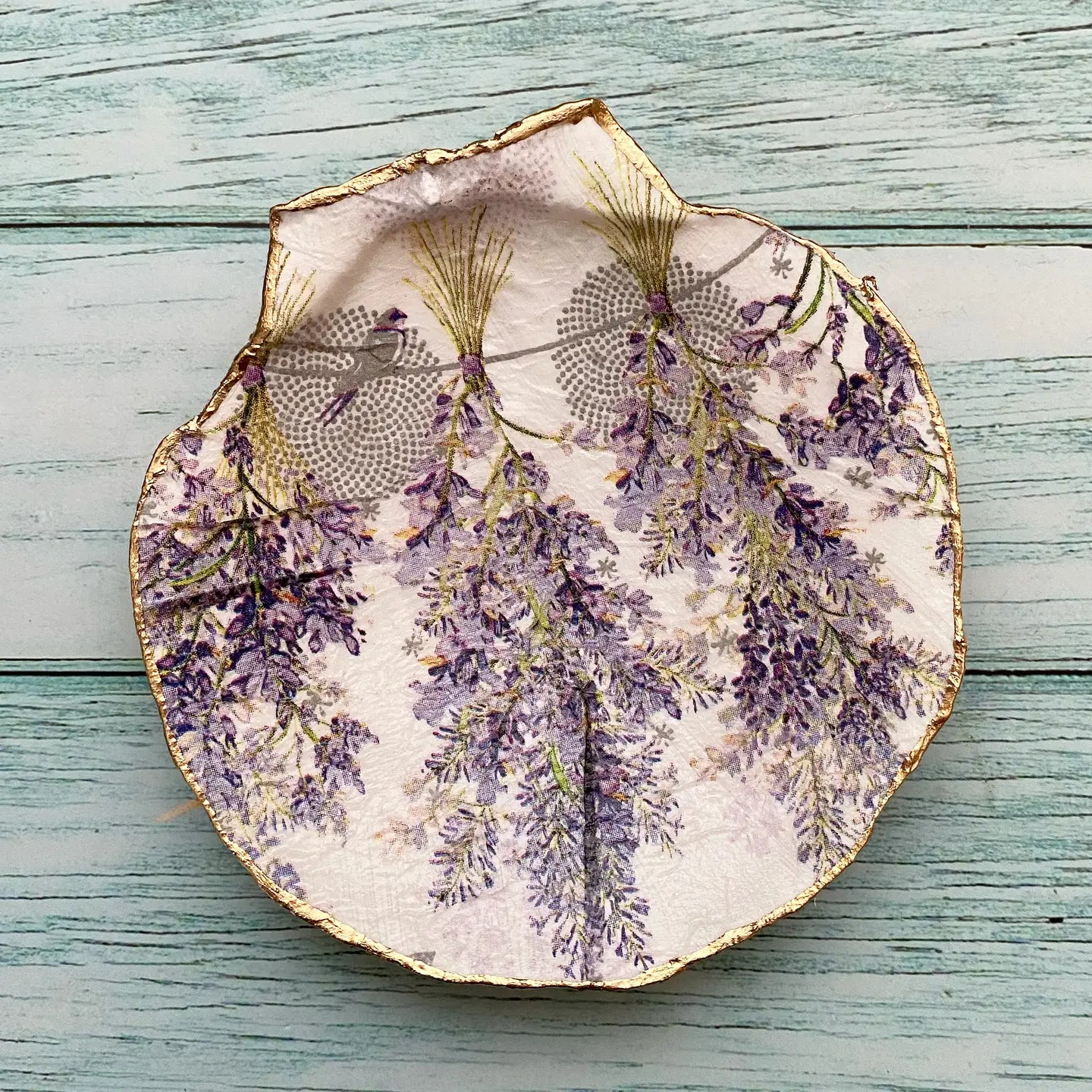 Handmade from local fisherman shells in New Jersey. They are decorated with recycled napkins, are glazed and finally painted with a gold trim along edges. Discarded shells are ground up and used in the artists garden