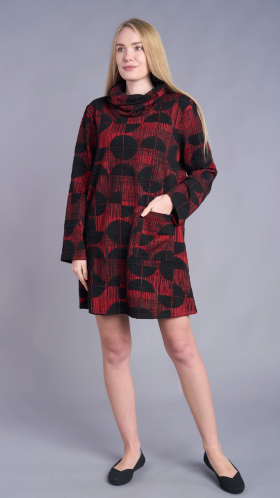 Shift style dress with a very slight a-line shape at the bottom, cowl neck, semi-fitted long sleeves, 2 front patch pockets and a rounded hem