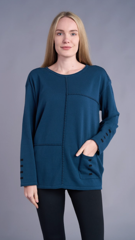 Relaxed, slight a-line style top with round neck, semi-relaxed 3/4 sleeves, 1 front patch pocket and stitching and seaming details