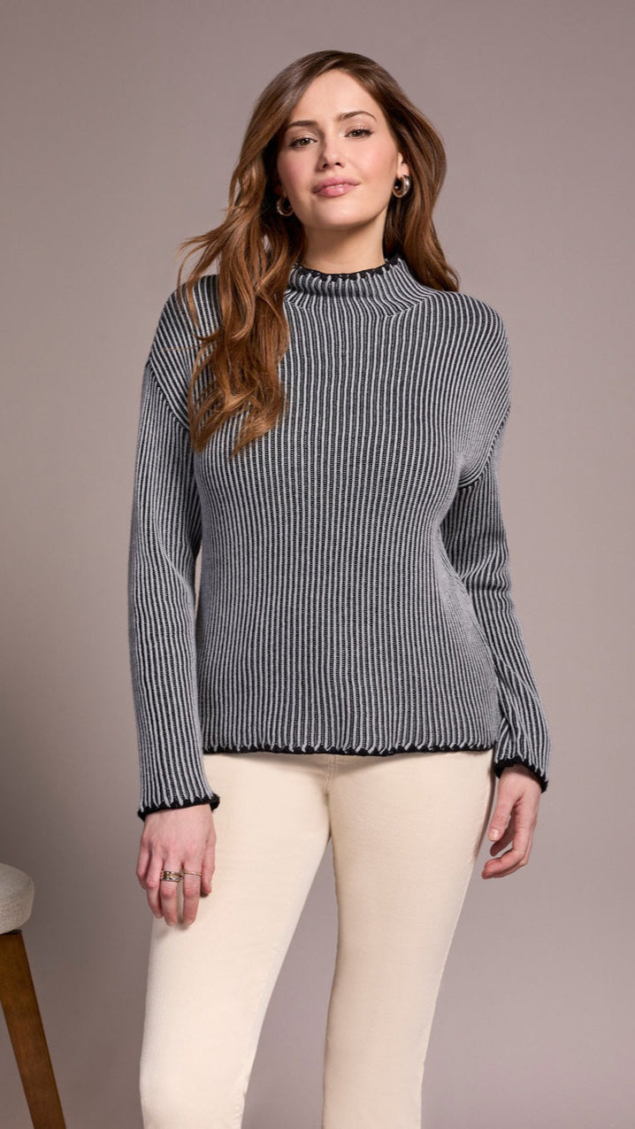 Straight style sweater with funnel neck, drop shoulder seaming detail, semi-fitted long sleeves and knit detailed hem
